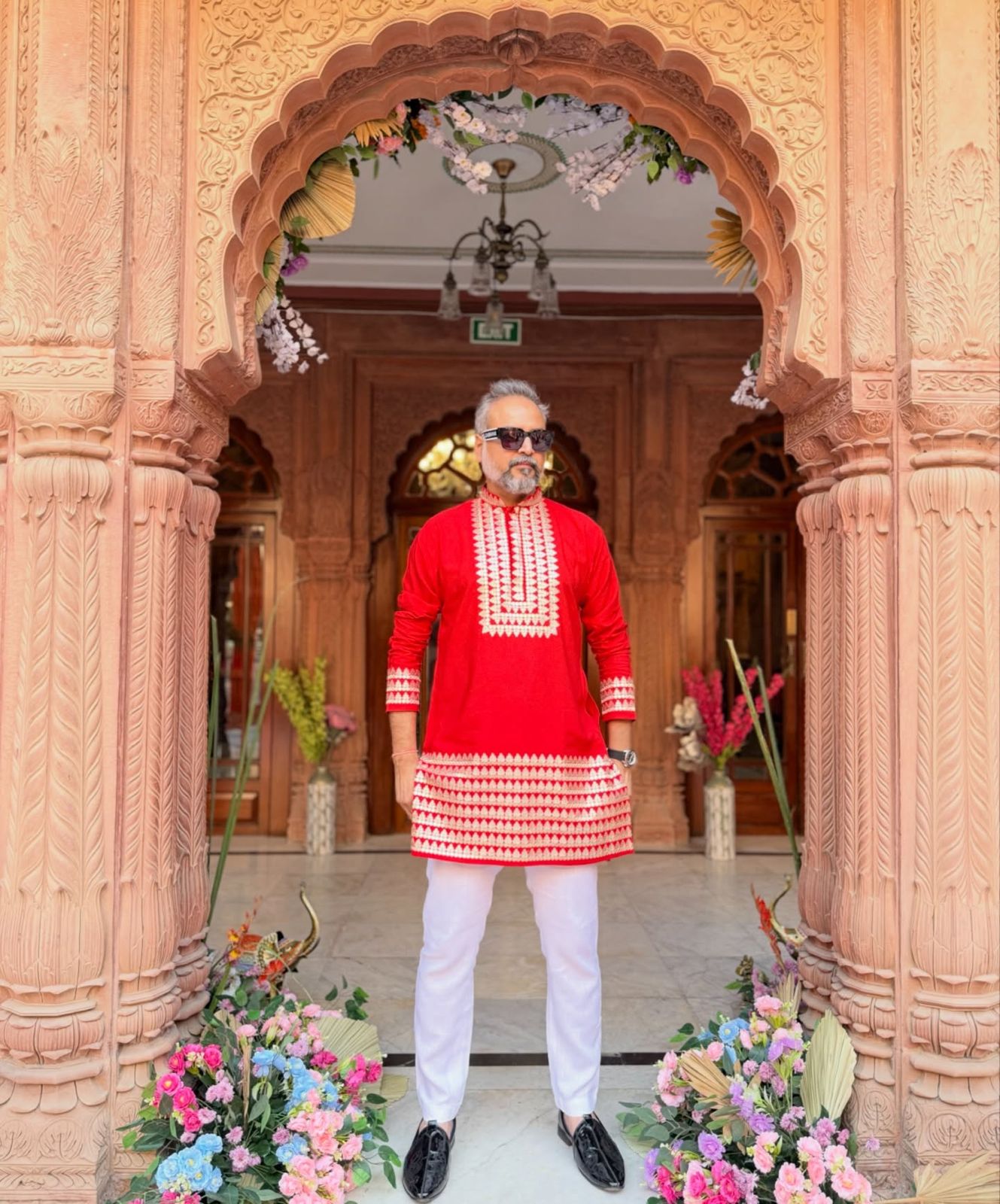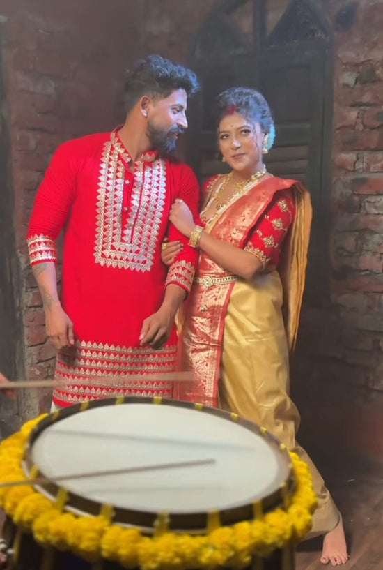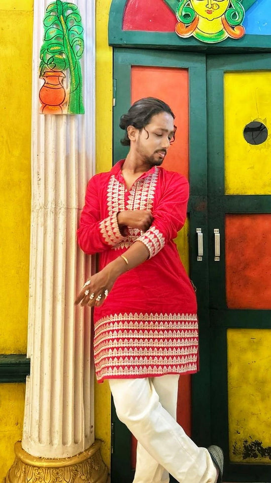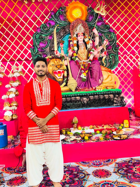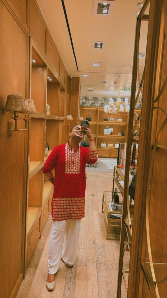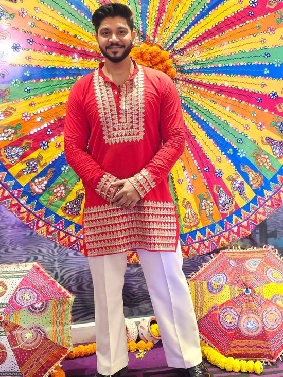 RED MIRROR EMBROIDERED WORK KURTA PAJAMA SET FOR MEN'S
