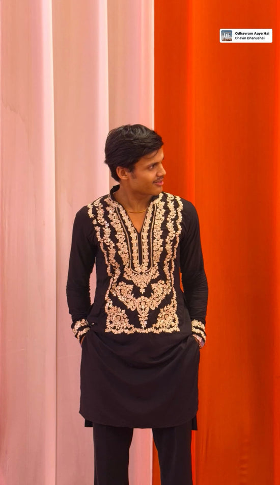 BLACK STYLISH NECK PATTERN EMBROIDERED WORK KURTA WITH PAJAMA FOR MENS