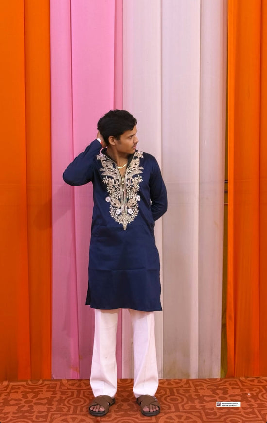 BLUE NACK SATIN MONKEY EMBROIDERED KURTA WITH PAJAMA SET