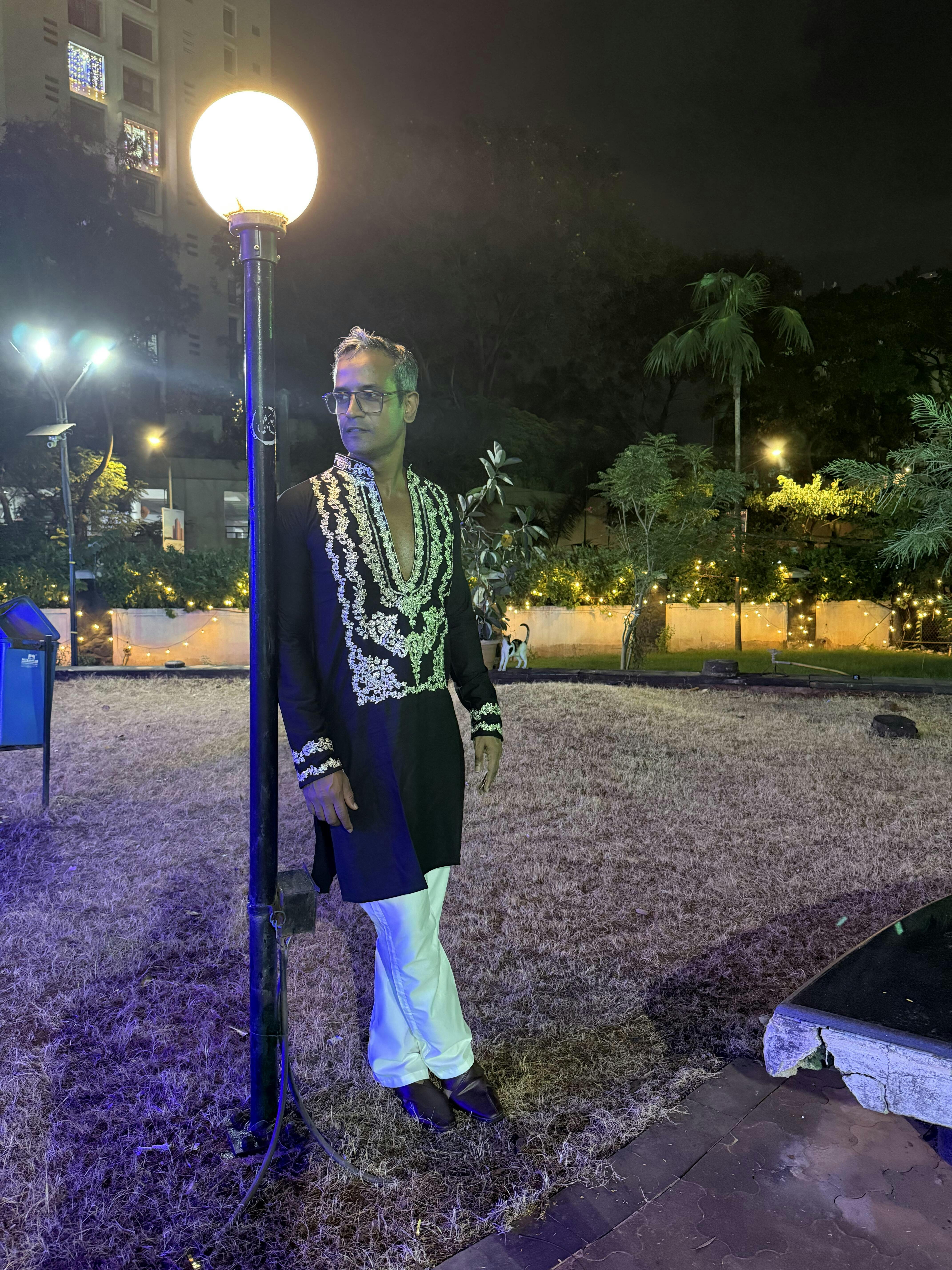 BLACK STYLISH NECK PATTERN EMBROIDERED WORK KURTA WITH PAJAMA FOR MENS