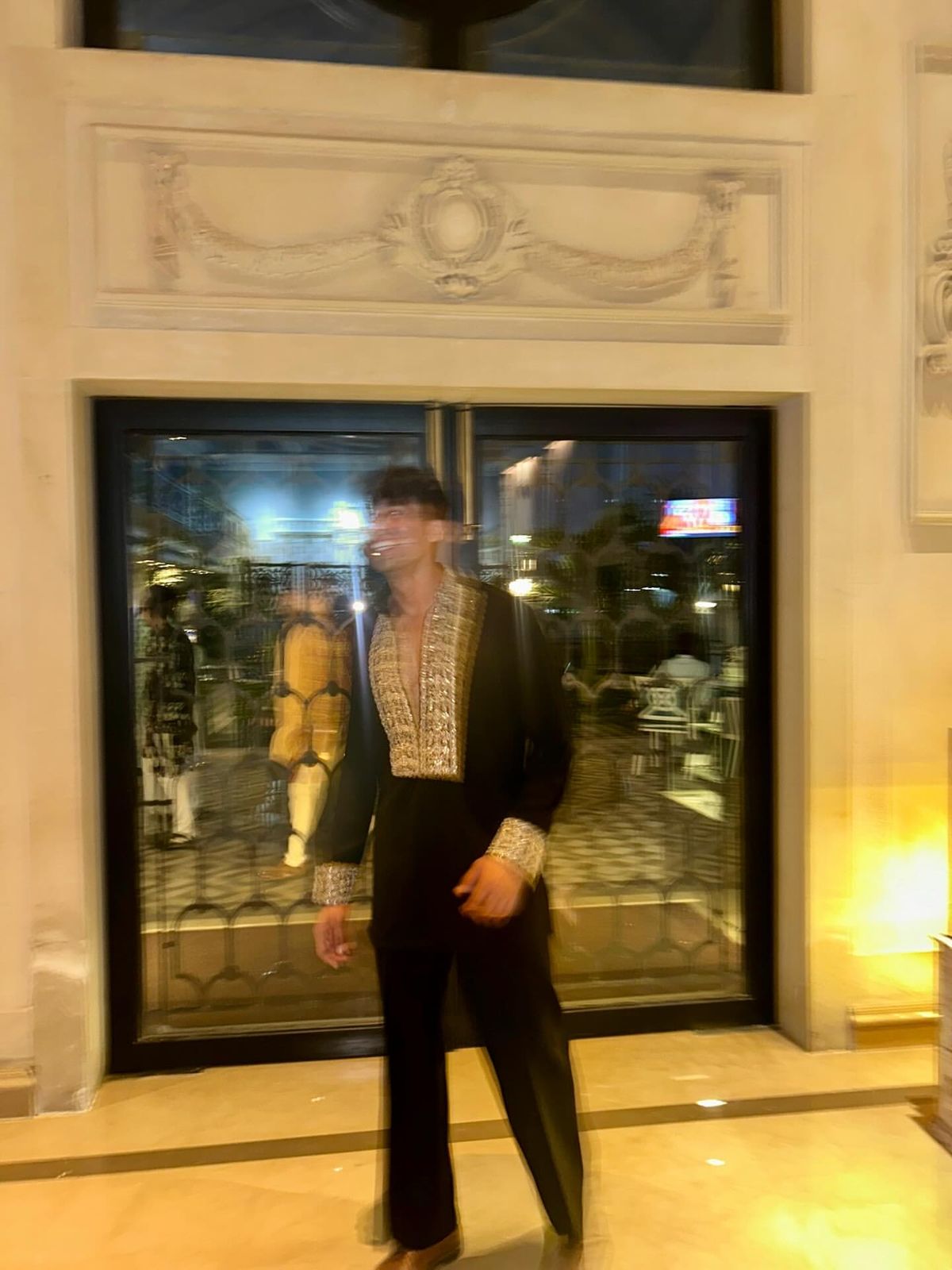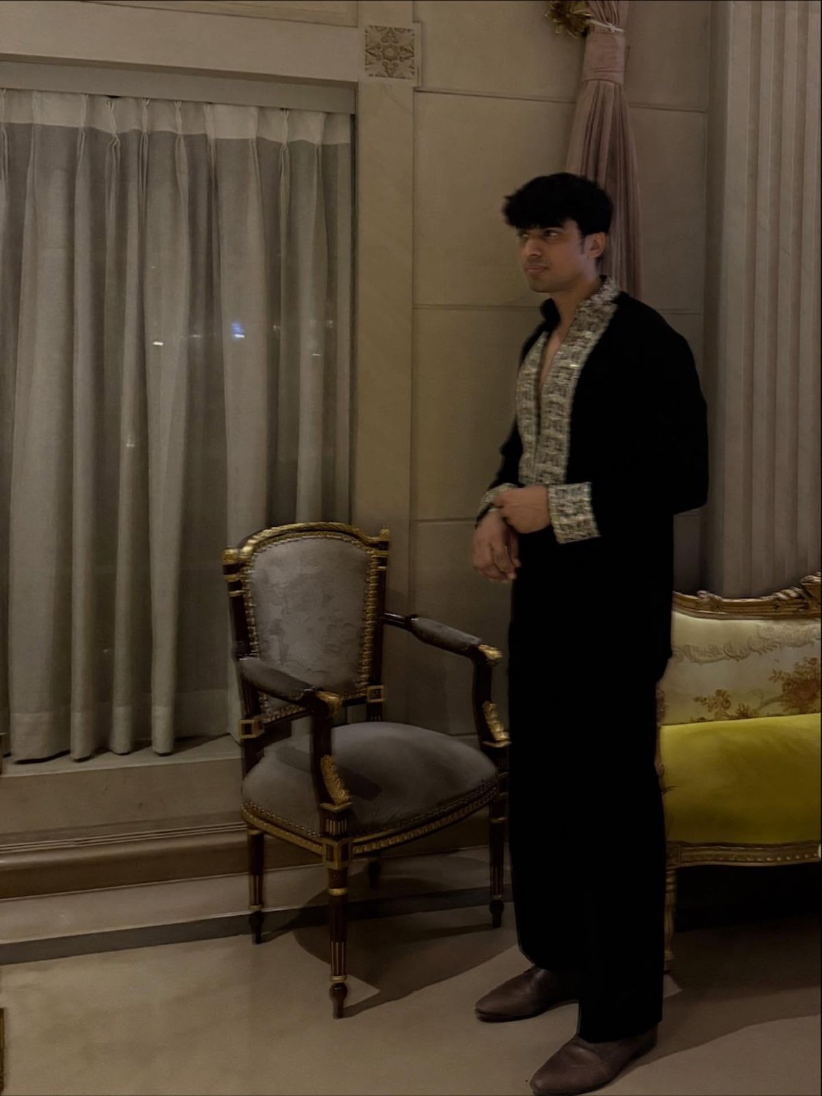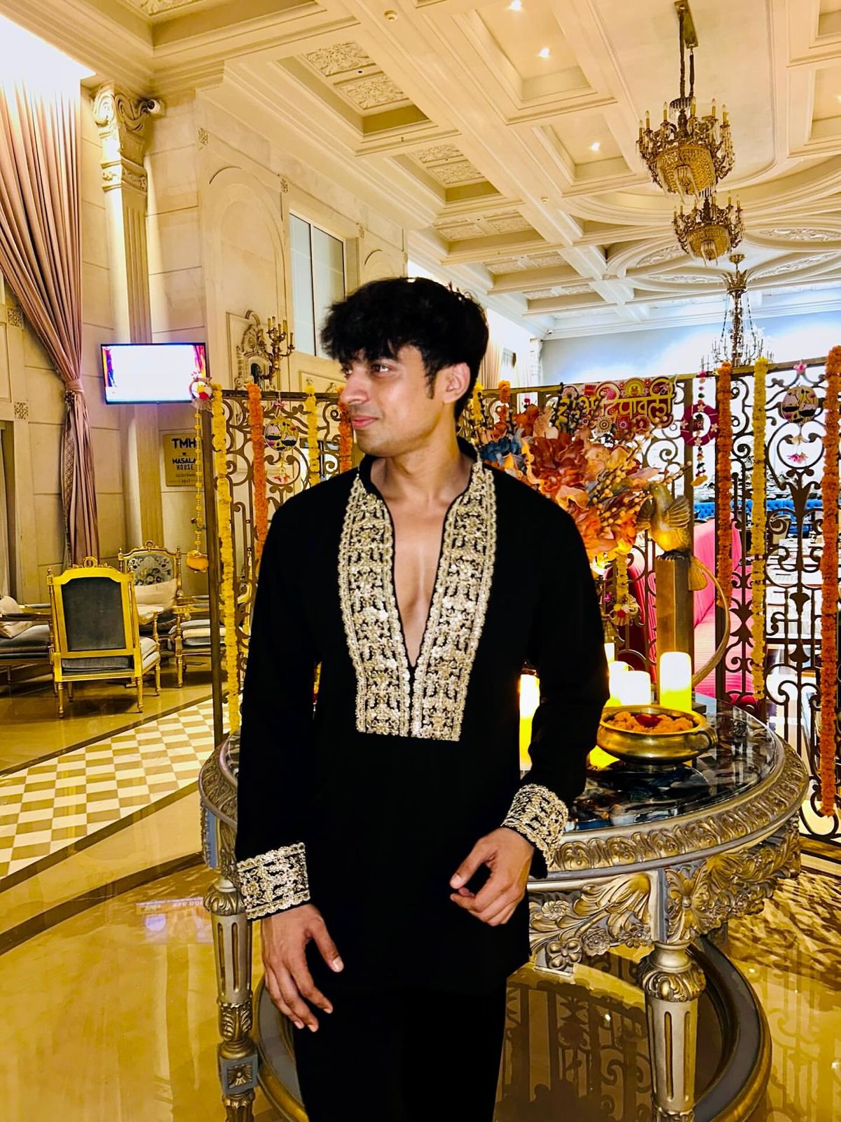 BLACK V NECK EMBROIDERD SHORT KURTA WITH PAJAMA SET
